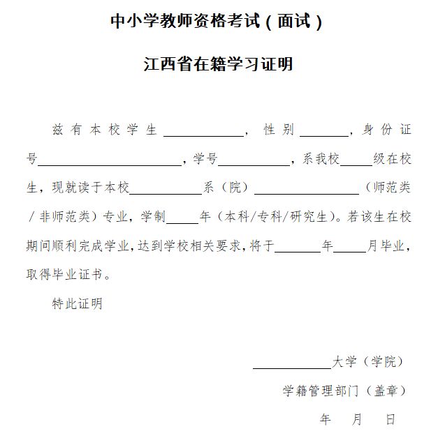 1. 本证明仅供江西省境内在校生参加中小学教师资格考试(面试)使用;(在校生可报名参加考试对象请参看“江西省2018年上半年中小学教师资格考试(面试)公告”)